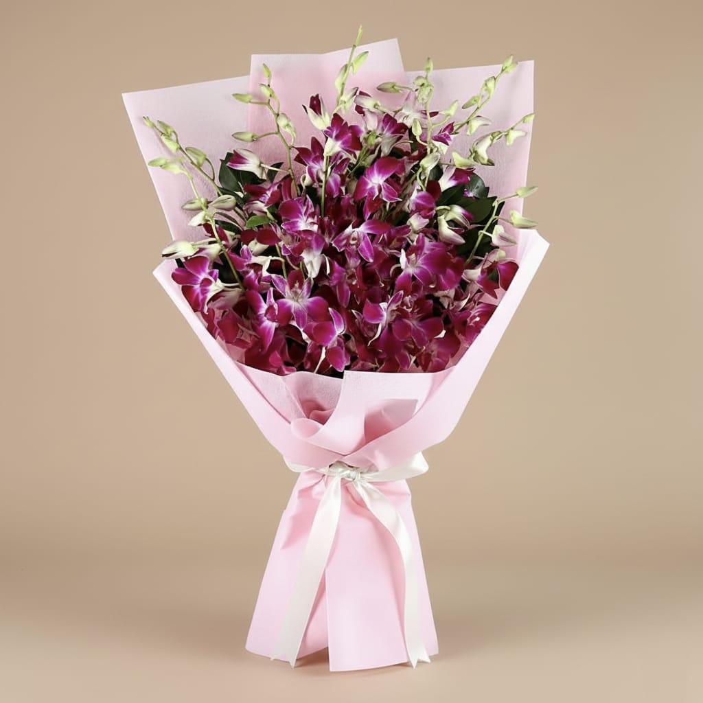 Delight your loved ones with this elegant arrangement of 10 stunning purple orchids, beautifully showcased in premium pink non-woven paper packing. The bouquet is artistically wrapped and finished with a crisp white ribbon, adding a soft and sophisticated touch. Paired with a delectable Cadbury Celebrations box, this combo brings together freshness and sweetness in perfect harmony. Ideal for birthdays, anniversaries, congratulations, or heartfelt surprises, this charming gift expresses love, joy, and appreciation in the most graceful way.