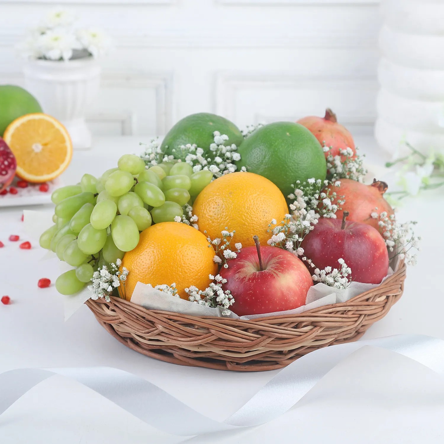 Experience the joy of gifting with this elegant fusion of nature’s finest treasures. Fresh limes, oranges, apples, pomegranates, and juicy grapes are beautifully arranged in a rustic brown cane basket, creating a vibrant and wholesome presentation. Accented with delicate gypsy fillers, this charming hamper blends the freshness of fruits with the beauty of floral elements. A thoughtful and refreshing gift choice for birthdays, celebrations, or heartfelt gestures perfect for sharing warmth, love, and life’s flavourful moments with someone special.