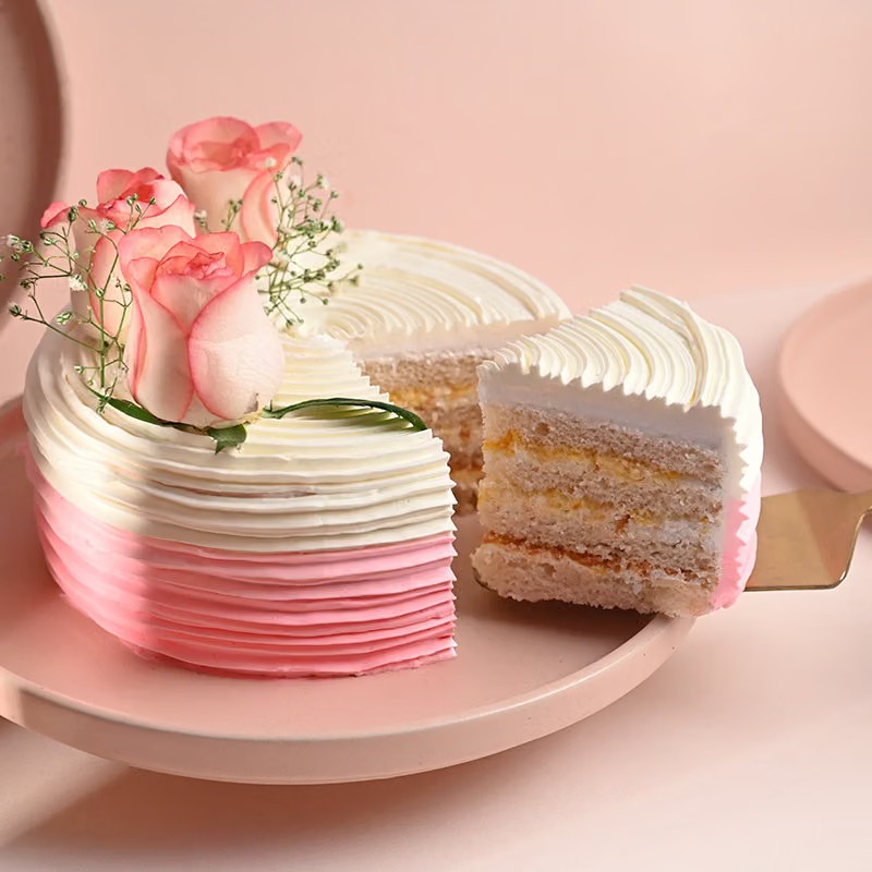 Celebrate elegance with our Pure Veg Butterscotch Cake topped with three fresh Jumilla Pink Roses. This charming creation features rich, creamy butterscotch layers wrapped in a smooth cream-to-pink ombré frosting design. The trio of soft blush roses paired with delicate baby’s breath adds a romantic, premium touch, making it perfect for birthdays, anniversaries, and special celebrations. Crafted with 100% vegetarian ingredients, this cake blends irresistible flavour with graceful beauty ideal for gifting or elevating your special moments.