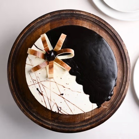 This choco-vanilla cake—the perfect blend of tempting chocolate and irresistible vanilla flavours, topped with white chocolates and red cherry.