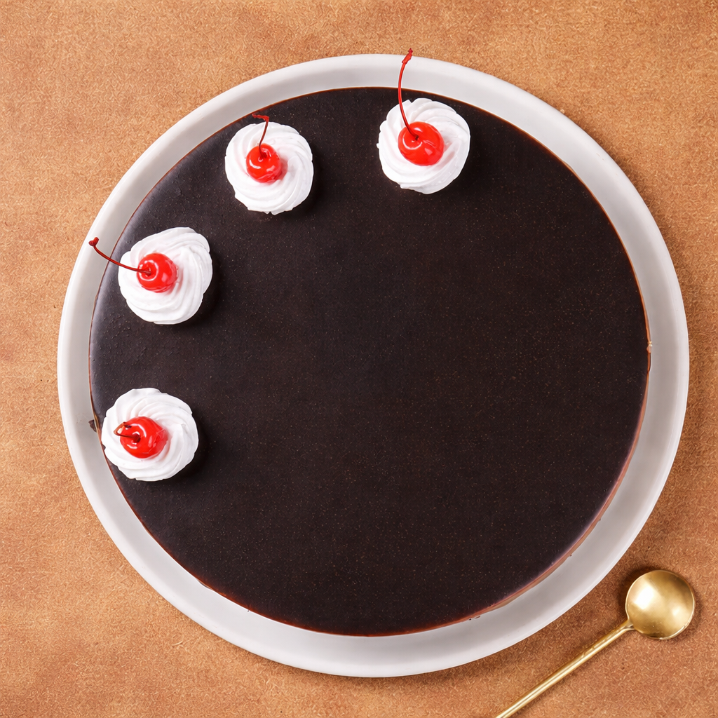 Indulge in the rich elegance of this Pure Veg Black Forest Cake, beautifully crafted for chocolate lovers. This round delight features a smooth, glossy dark chocolate ganache topping that drips gracefully over soft vanilla whipped cream sides. The base is finished with delicate chocolate shavings, adding a subtle crunch to every bite. Topped with fluffy white cream swirls and bright red cherries, it offers the perfect balance of sweetness and richness. Ideal for birthdays, celebrations, or special moments, this cake is a classic treat with a premium, bakery-style finish.