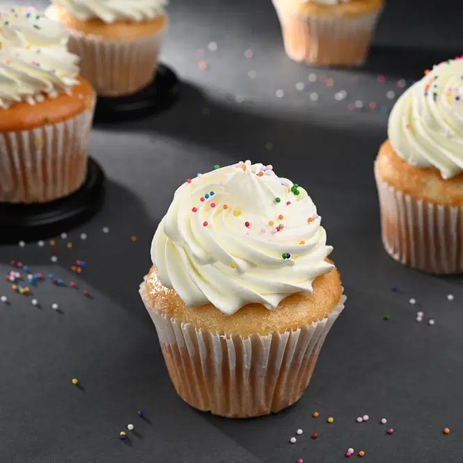 This vanilla cupcake is as irresistible as it looks soft, fluffy, and topped with a swirl of rich vanilla whipped cream. Finished with colorful edible sprinkles, it’s a perfect little treat to brighten any celebration.