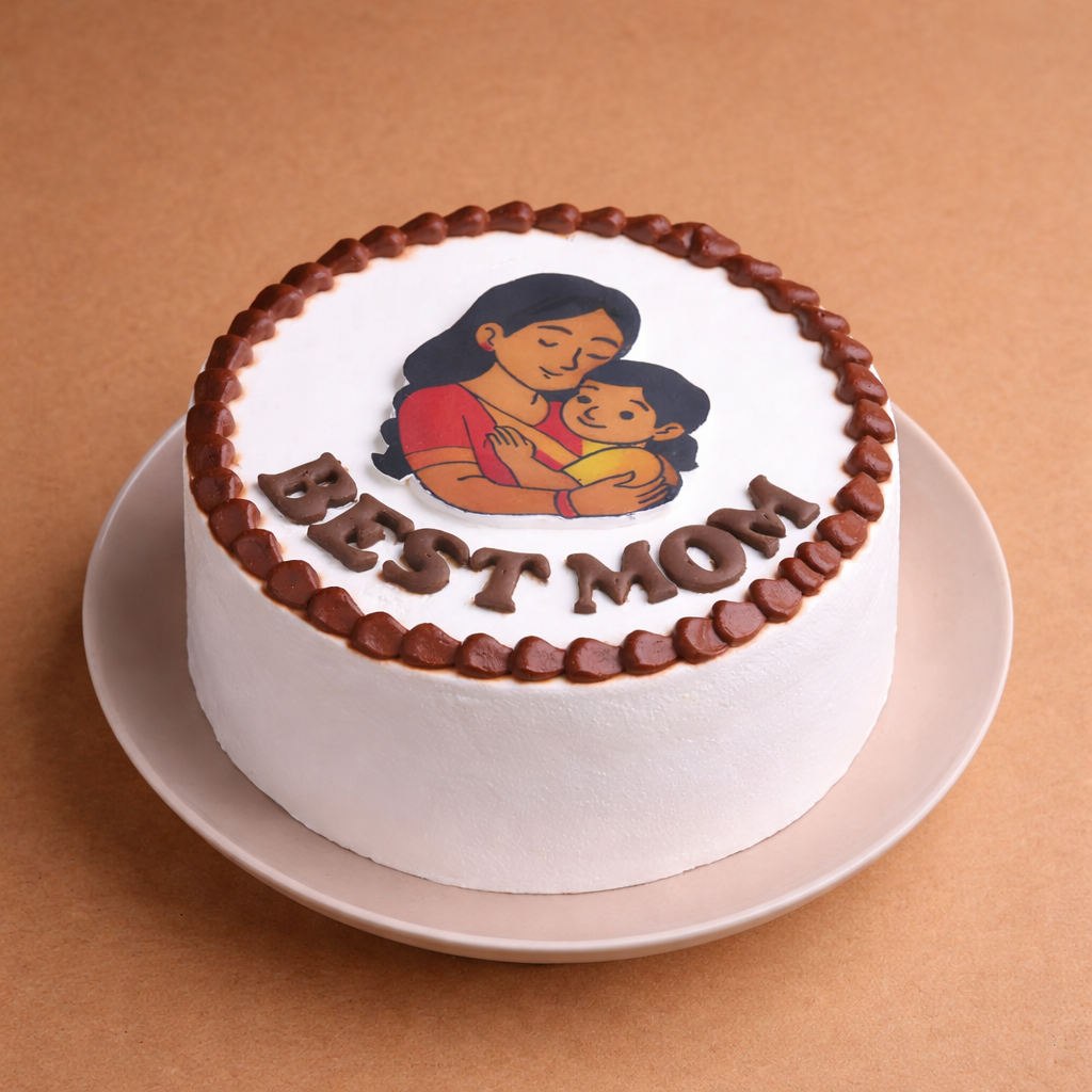 Delight your loved ones with this elegant pure veg photo print cake, beautifully crafted to celebrate the bond of love. Featuring a smooth white cream finish, the cake is adorned with a heartwarming edible print of a mother and child, symbolizing care and affection. The rich chocolate piping along the edges and the “BEST MOM” message add a charming touch. Placed on a subtle light brown backdrop, this cake looks premium and inviting perfect for Mother’s Day or any special occasion to express gratitude and love.