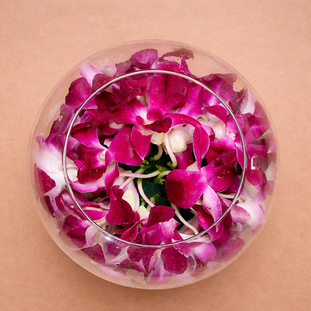 This elegant floral arrangement features vibrant purple orchids beautifully displayed in a clear glass vase. The delicate orchid petals, with their rich magenta tones and soft white accents, create a striking yet graceful appearance. Carefully arranged inside the transparent bowl, the blossoms form a lush and refreshing display that highlights their natural beauty. The minimal glass vase enhances the visual appeal by allowing the colors and textures of the flowers to stand out. Perfect for home décor, celebrations, or gifting, this orchid arrangement adds a touch of sophistication, freshness, and charm to any space.