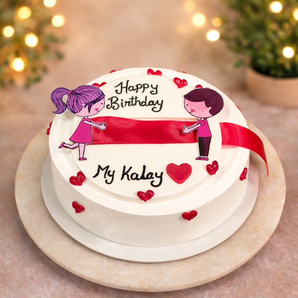 Celebrate love and sweetness with this beautifully crafted romantic cake. Designed in a classic white finish, it is elegantly adorned with a vibrant red ribbon and tiny heart accents that symbolize affection and warmth. The top features a cute couple illustration reaching out to each other, along with a heartfelt “Happy Birthday” message and personalized name detailing. Simple yet charming, this cake is perfect for expressing love on special occasions making every moment feel extra special and memorable.