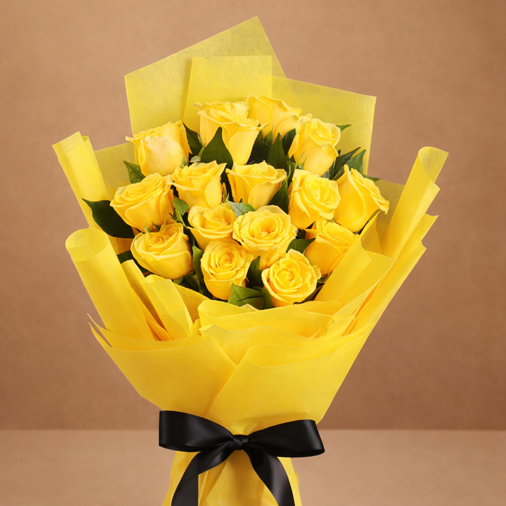 Brighten any moment with this elegant bouquet of fresh yellow roses, beautifully wrapped in premium yellow non-woven paper. Each bloom radiates warmth, joy, and positivity, making it a perfect gift for celebrations, gratitude, or simply to uplift someone’s day. The arrangement is neatly finished with a classic black ribbon, adding a touch of sophistication and contrast. Fresh, vibrant, and thoughtfully styled, this bouquet is ideal for birthdays, anniversaries, or special surprises that speak from the heart.
