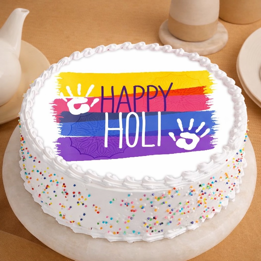 Celebrate the festival of colors with our Pure Veg Vanilla Holi Photo Print Cake, a perfect blend of taste and festivity. Made with soft, fluffy vanilla sponge layers and smooth, creamy frosting, this cake is topped with a vibrant edible Holi-themed photo print that adds a joyful touch to your celebration. Beautiful cream borders and colorful sprinkles enhance its festive charm. Prepared using 100% vegetarian ingredients, it’s ideal for Holi parties, family gatherings, and gifting. Deliciously light and delightfully sweet, this cake makes every Holi moment extra special and memorable.