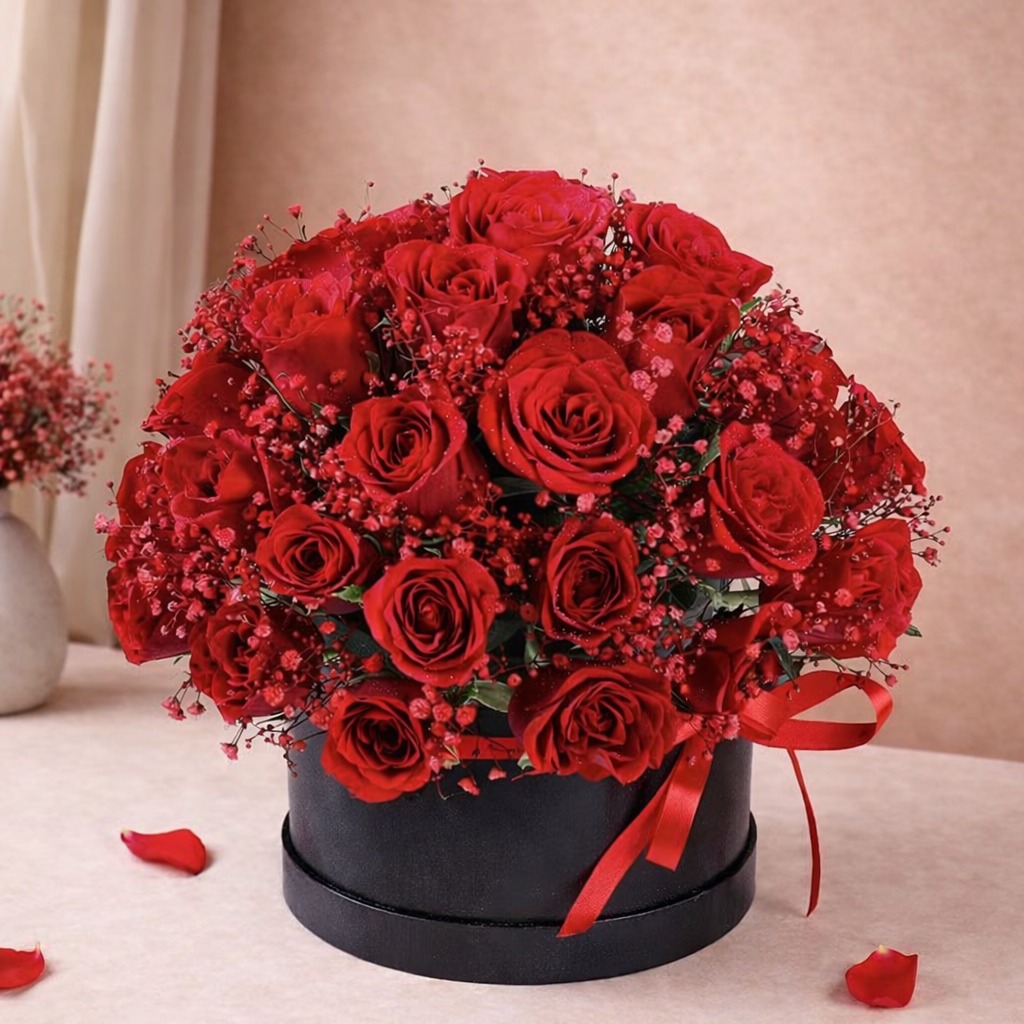 Indulge in timeless elegance with this premium arrangement of velvety red roses, beautifully complemented by red-sprayed gypsy flowers for a rich and graceful look. Presented in a sleek black round box and delicately tied with a classic red ribbon, this arrangement exudes luxury and passion. Every bloom is thoughtfully placed to create a full, captivating display, making it a perfect choice for anniversaries, Valentine’s Day, proposals, or meaningful celebrations. A sophisticated expression of love designed to leave a lasting impression.