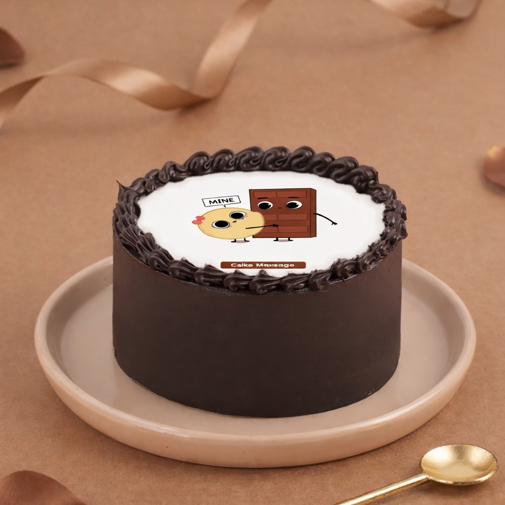 A rich and indulgent pure veg chocolate cake, finished with smooth chocolate frosting and elegant piped borders, perfect for gifting on special occasions. The cake features a high-quality edible photo print that adds a personal and playful touch, making it ideal for Valentine’s Day, anniversaries, birthdays, or surprises for your loved ones. Soft, moist layers paired with creamy chocolate ganache deliver a delightful taste in every bite. Beautifully presented on a premium base, this cake is crafted with 100% eggless ingredients and premium-quality chocolate. A perfect blend of taste and presentation to make every celebration sweeter and more memorable.