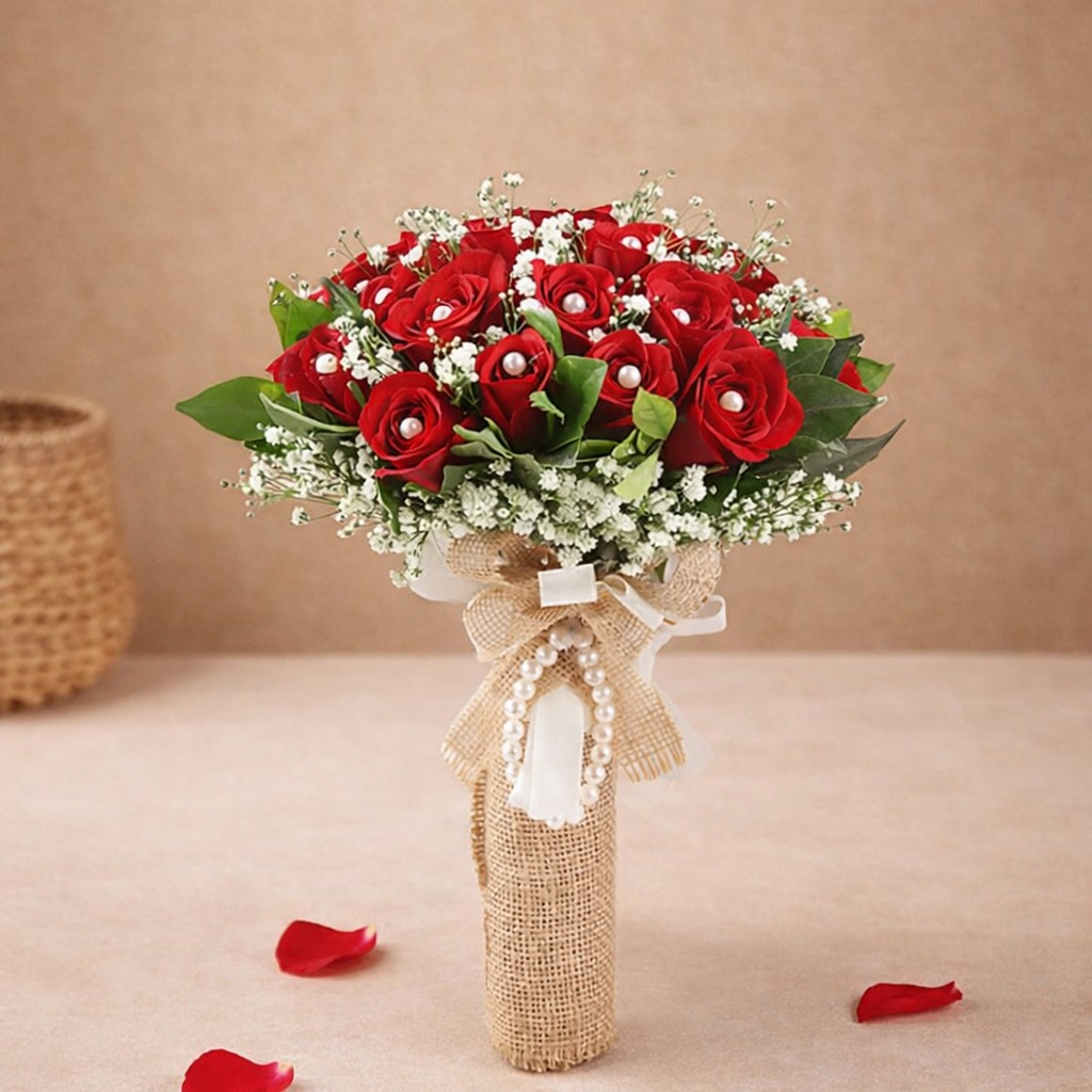 This stunning bouquet features 25 fresh red roses, elegantly highlighted with white pearls and delicate white baby’s breath, creating a perfect harmony of romance and sophistication. Wrapped in natural jute packing and finished with a graceful ribbon, the arrangement offers a rustic yet luxurious appeal. Ideal for anniversaries, Valentine’s Day, proposals, or special celebrations, this handcrafted bouquet expresses deep love and timeless elegance, making every moment truly memorable.