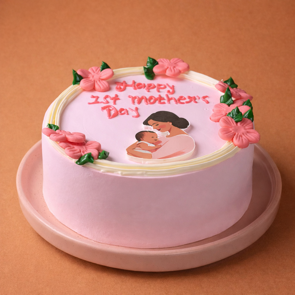 Celebrate the joy of motherhood with this beautifully crafted 1st Mother’s Day cake. Designed in a soft pastel pink finish, the cake features delicate floral accents and a heartfelt illustration of a mother holding her baby, symbolizing pure love and warmth. The elegant “Happy 1st Mother’s Day” message adds a personal touch, making it perfect for this special milestone. Ideal for gifting or celebrating at home, this cake combines charm and sweetness to create a truly memorable moment.