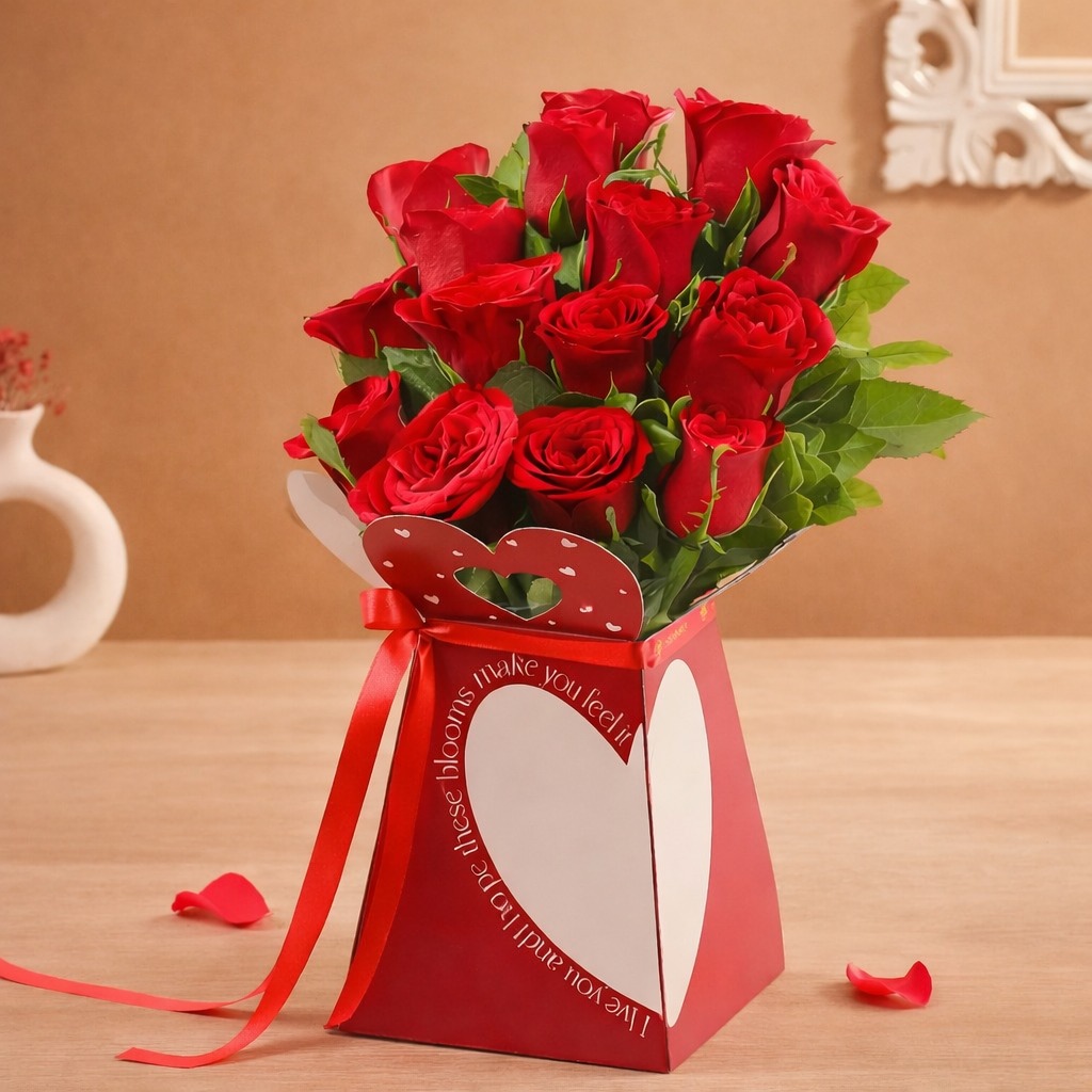 Express timeless love with this elegant arrangement of fresh red roses, beautifully presented in a charming heart-designed box. Each rose symbolizes deep affection and romance, carefully arranged to create a stunning visual impact. The premium red box with heart detailing and satin ribbon adds a touch of luxury, making it an ideal gift for Valentine’s Day, anniversaries, birthdays, or special moments. A perfect blend of passion, beauty, and sophistication that speaks straight from the heart.
