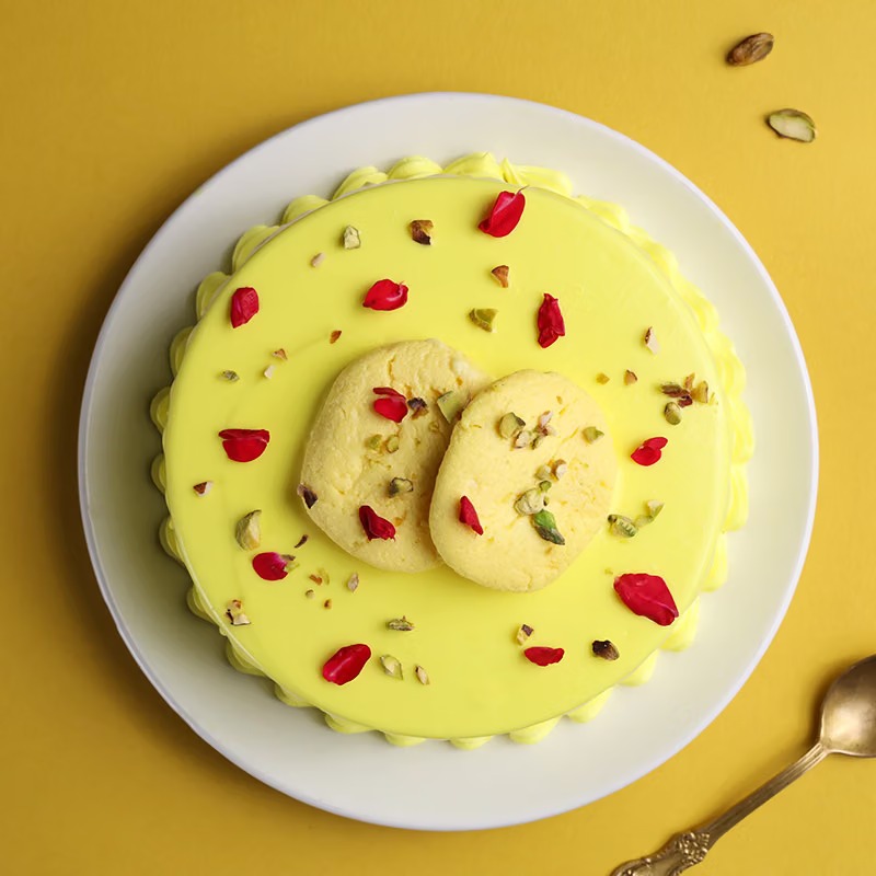 Indulge in the royal flavours of our Pure Veg Rasmalai Cake, a perfect fusion of traditional sweetness and modern delight. This gorgeous dessert features soft, creamy rasmalai placed atop a rich saffron-infused cake, adorned with elegant rose petals and crunchy pistachios. Its smooth yellow glaze and delicate drizzle add irresistible charm. Ideal for festive celebrations, birthdays, and special moments, this cake brings authentic Indian flavours to every slice with pure vegetarian goodness.
