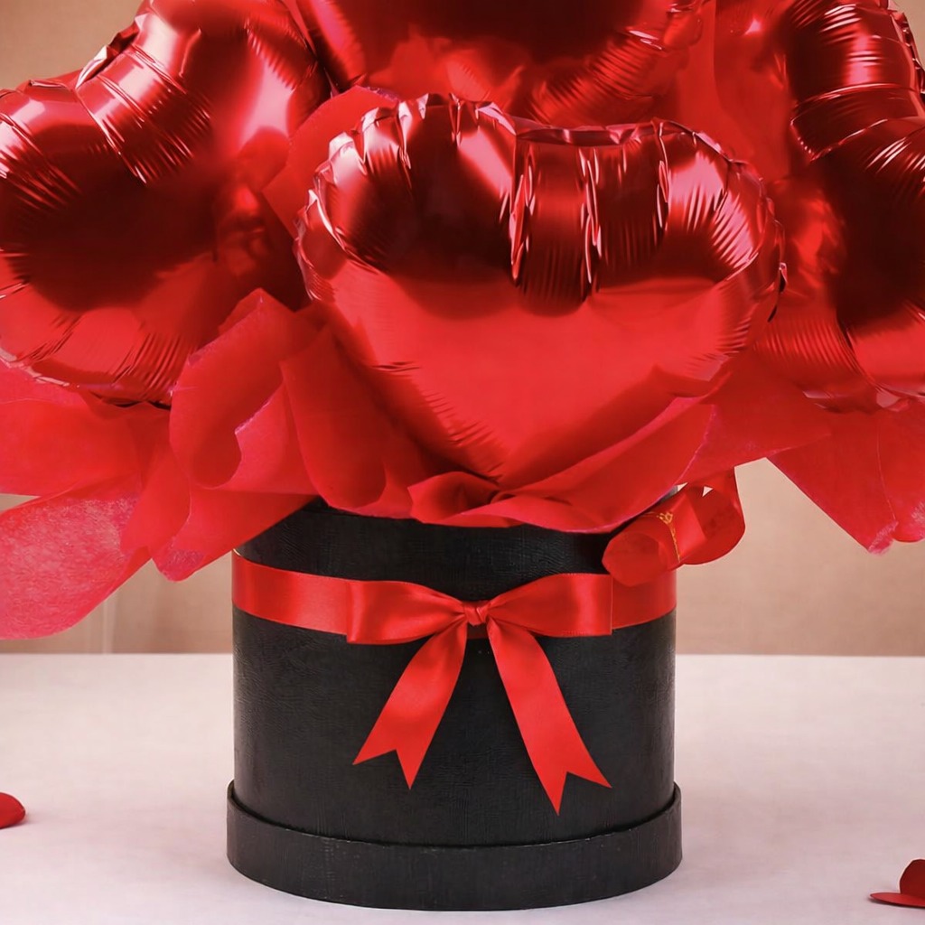 This elegant mini heart-shaped foil balloon arrangement is a perfect expression of love and celebration. Designed with premium red heart balloons, wrapped in rich red non-woven paper, and beautifully placed in a sleek black round box, it creates a stunning luxury gift. Finished with a classy red ribbon bow, this arrangement adds charm and romance to any special moment. Ideal for Valentine’s Day, anniversaries, proposals, or surprise gestures, it’s a delightful way to make your loved one feel truly special with a touch of premium elegance.