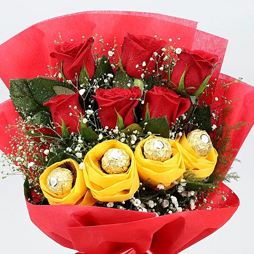 This elegant bouquet features 6 fresh red roses, symbolizing deep love and affection, beautifully paired with 4 Ferrero Rocher chocolates wrapped in vibrant yellow paper for a luxurious touch. Accented with delicate baby’s breath and lush green fillers, the arrangement is wrapped in premium red paper and finished with a stylish bow. Perfect for birthdays, anniversaries, or romantic surprises, this bouquet blends the charm of roses with the sweetness of chocolates, making it an unforgettable gift for someone special.