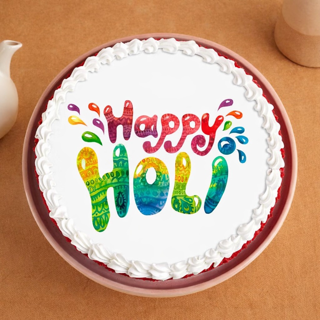 Celebrate Holi with this delightful Pure Veg Red Velvet Photo Print Cake, crafted to add sweetness and color to your special moments. Featuring a rich, moist red velvet base layered with smooth, creamy frosting, this cake is topped with a vibrant edible photo print that brings your celebration to life. The soft texture and perfectly balanced sweetness make every bite irresistible. Beautifully finished with fresh cream borders and premium-quality ingredients, it’s 100% vegetarian and perfect for festive gatherings, gifting, or surprise celebrations. A delicious centerpiece that tastes as good as it looks!