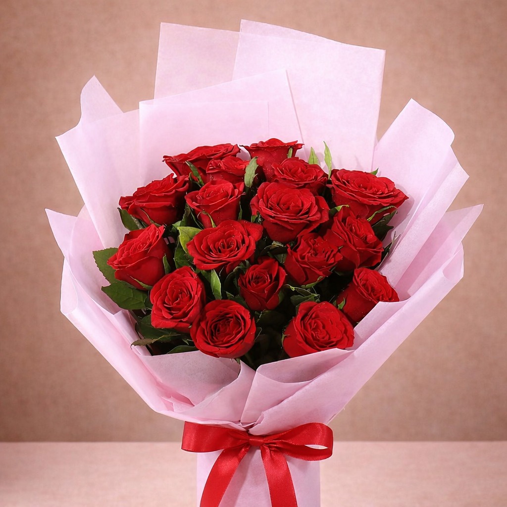 This beautiful red rose bouquet features fresh, vibrant red roses elegantly wrapped in soft pink non-woven paper and finished with a classic red ribbon. The rich red blooms symbolize love and passion, while the pastel pink wrapping adds a touch of grace and charm. Perfect for birthdays, anniversaries, Valentine’s Day, proposals, or romantic surprises, this bouquet is thoughtfully handcrafted to create a timeless and heartfelt expression of emotions.