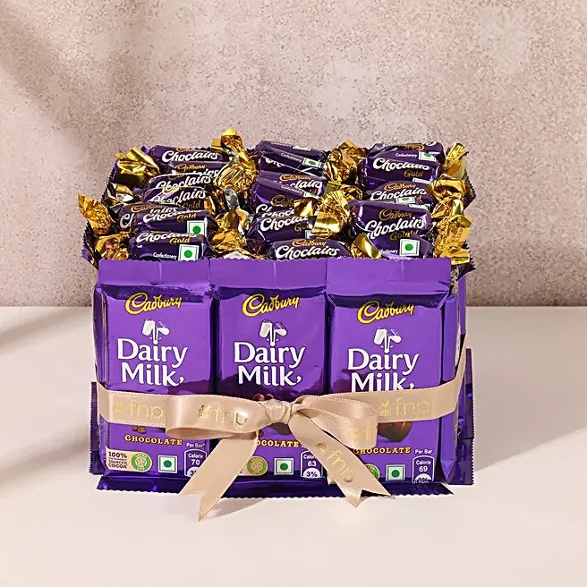 Delight your loved ones with this indulgent Cadbury Chocolate Hamper, beautifully arranged with classic Cadbury Dairy Milk bars and assorted Cadbury Chocolairs. Neatly packed and finished with an elegant ribbon, this hamper is perfect for birthdays, anniversaries, festivals, or as a sweet surprise to brighten someone’s day