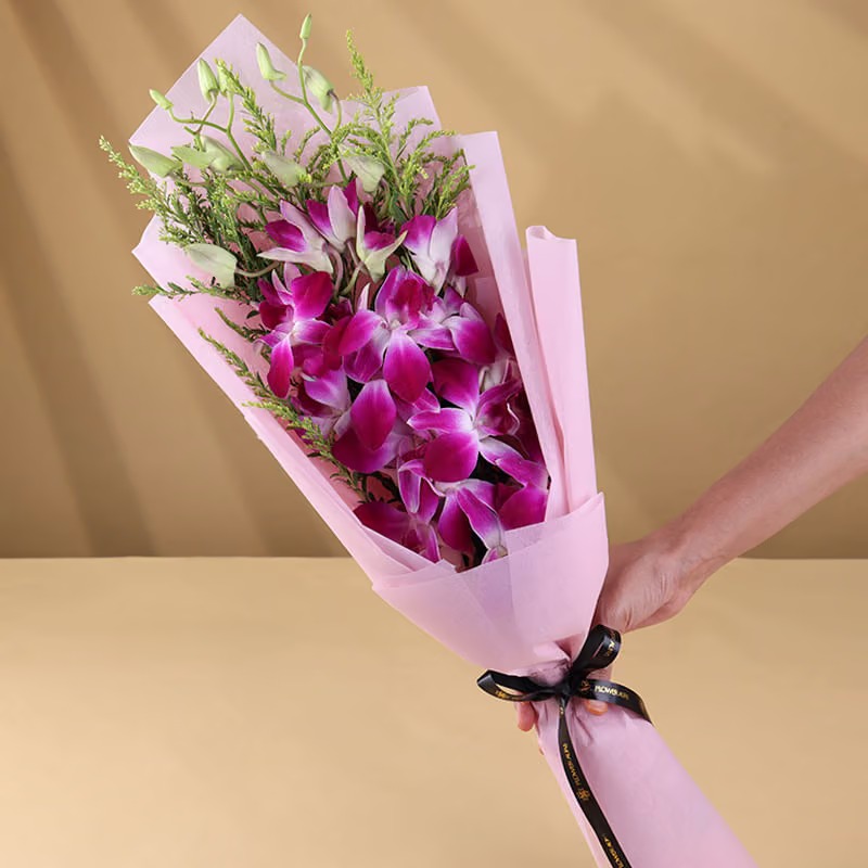 Celebrate special moments with this delightful pure veg pineapple cake paired with a charming bunch of 3 fresh purple orchids. The cake features soft, moist layers infused with sweet pineapple flavour, finished with elegant cream detailing for a refreshing taste in every bite. Complementing the cake is a graceful orchid arrangement, beautifully wrapped in pink paper and tied with a classic black ribbon for a refined look. Ideal for birthdays, anniversaries, or thoughtful gifting, this combo blends freshness, elegance, and sweetness into one memorable surprise.