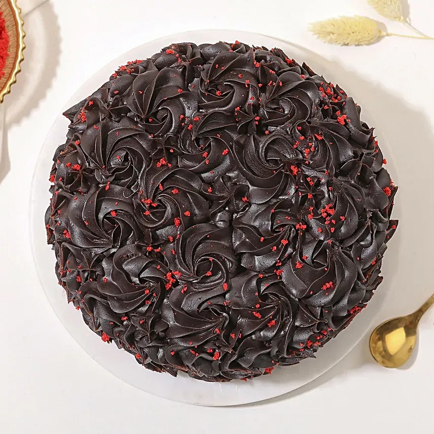 Indulge in this rich Eggless Truffle Red Velvet Cake, featuring a moist red velvet base wrapped in smooth, chocolate truffle swirls. The striking design with red crumble highlights makes it a perfect choice for birthdays, celebrations, or gifting. Decadent, elegant, and beautifully crafted, this cake delivers the ideal blend of flavour and luxury in every bite.