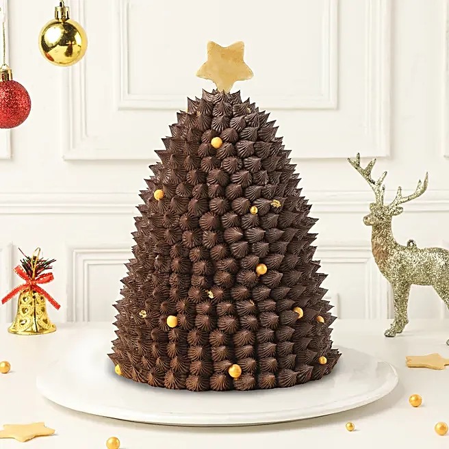 Surprise someone with a festive showstopper that brings Christmas cheer to the table. This delightful pure veg chocolate cream cake is crafted in the shape of a Christmas tree, complete with rich chocolate piping, elegant golden accents, and a star perched on top. Its indulgent chocolate flavor and whimsical design make it a standout gift for family, friends, or colleagues who appreciate something both delicious and beautifully themed. A charming way to make holiday moments feel extra special and sweet.