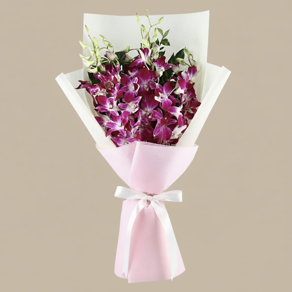 Bright and elegant, this bouquet of 10 vibrant purple orchids is beautifully arranged in a stylish off-white and pink paper packing, finished with a soft white ribbon for a graceful touch. The fresh orchids showcase their exotic charm, making this ensemble perfect for celebrating special moments or expressing heartfelt emotions. Paired with a delightful 16 pcs Ferrero Rocher box, this gift set blends floral beauty with premium indulgence, creating a thoughtful and memorable surprise for your loved ones. Ideal for birthdays, anniversaries, or heartfelt wishes, this combination adds luxury and sweetness to any occasion.