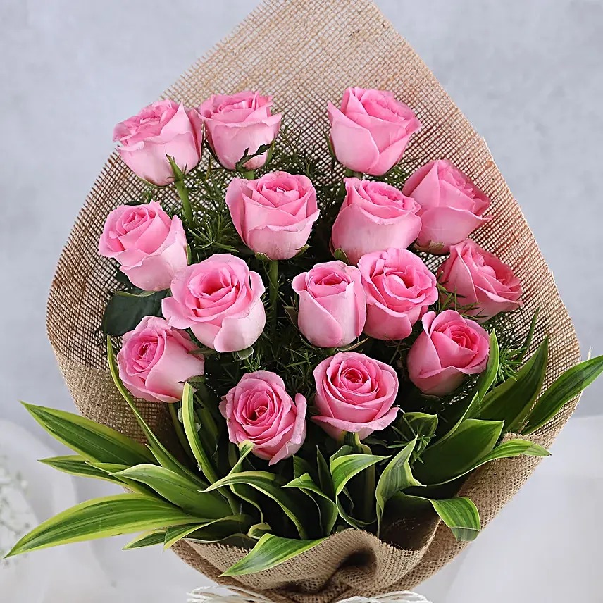 Express love, admiration, and heartfelt emotions with this elegant bouquet of 15 Aqua Pink Roses, beautifully wrapped in rustic brown jute packing and tied with a off white raffia bow. The soft pastel pink hue of the roses symbolizes grace, appreciation, and joy, making it the perfect gift for birthdays, anniversaries, congratulations, or romantic celebrations. Freshly handpicked and artfully arranged with lush green fillers, this bouquet brings a charming and natural look. The eco-friendly jute wrapping adds a touch of sophistication and warmth, making the gesture even more meaningful. Surprise someone special with this delightful floral arrangement and brighten their day instantly.