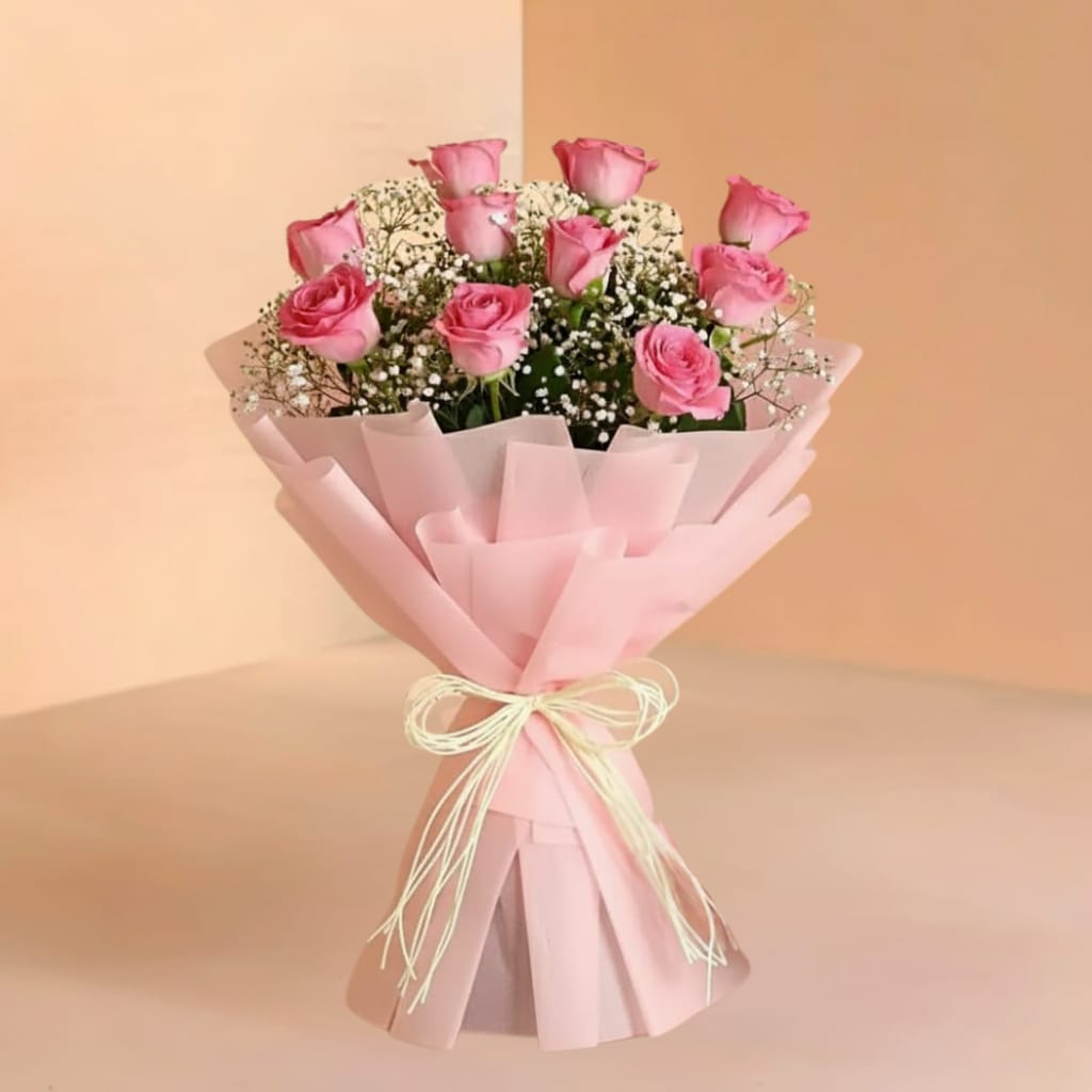 A stunning bouquet of 10 vibrant aqua pink roses, nestled with delicate baby's breath, beautifully wrapped in matching pink paper. Paired with a rich, glossy chocolate truffle cake, featuring dark chocolate ganache drip and elegant chocolate garnish. The perfect gift for any joyous celebration.
