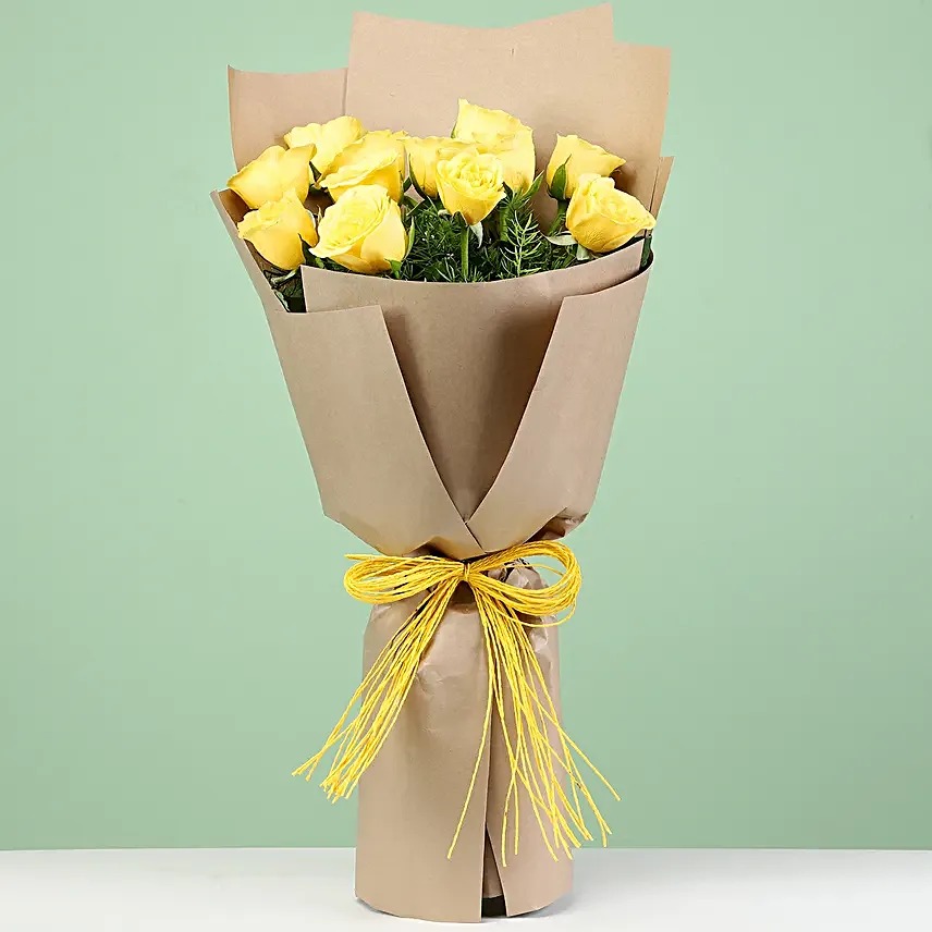 Celebrate meaningful connections with this earthy and elegant bouquet of vibrant yellow roses. Wrapped in eco-friendly kraft paper and tied with a rustic yellow thread bow.