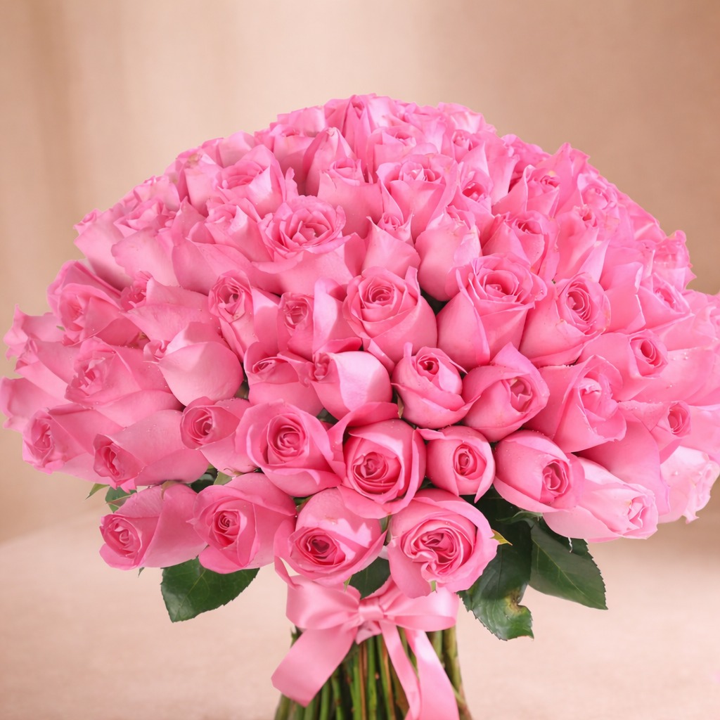 A breathtaking bouquet of 150 premium pink roses, elegantly hand-tied with a soft pink satin ribbon, creating a vision of grace and affection. Each bloom is carefully selected for its delicate hue and velvety petals, symbolizing admiration, sweetness, and heartfelt love. The lush arrangement forms a perfectly rounded silhouette, exuding timeless beauty and refined charm. Ideal for grand celebrations, anniversaries, or heartfelt confessions, this luxurious pink rose bunch speaks the language of romance and elegance, making every moment feel truly special and unforgettable.