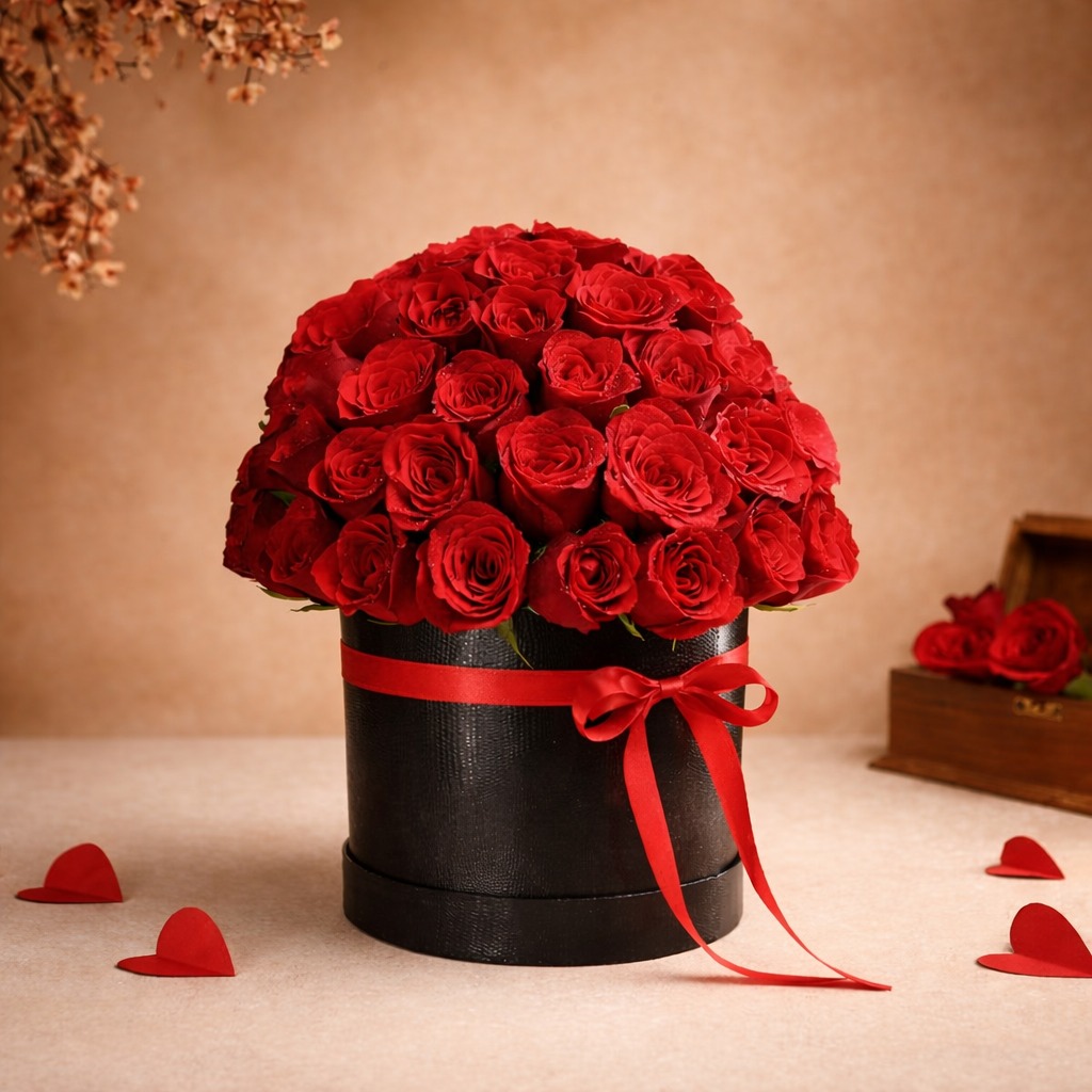 This elegant arrangement features lush, velvety red roses artistically set in a premium black round box, finished with a classic red satin ribbon. Each rose symbolizes deep love and passion, creating a bold yet timeless expression of romance. The rich contrast of vibrant red blooms against the sleek black box adds a touch of modern luxury, making it perfect for anniversaries, Valentine’s Day, proposals, or grand romantic gestures. Designed to impress, this arrangement speaks of sophistication, heartfelt emotions, and unforgettable moments.