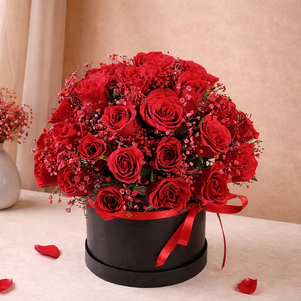 Indulge in timeless elegance with this premium arrangement of velvety red roses, beautifully complemented by red-sprayed gypsy flowers for a rich and graceful look. Presented in a sleek black round box and delicately tied with a classic red ribbon, this arrangement exudes luxury and passion. Every bloom is thoughtfully placed to create a full, captivating display, making it a perfect choice for anniversaries, Valentine’s Day, proposals, or meaningful celebrations. A sophisticated expression of love designed to leave a lasting impression.