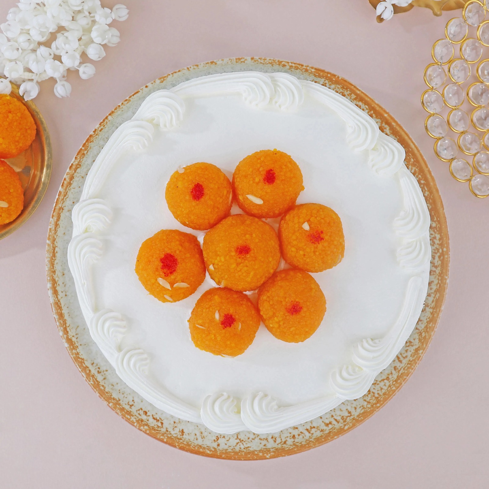 Surprise your loved ones with the Motichoor Laddoo Fusion Cake, a delightful combination of traditional and contemporary flavours. This cream cake is uniquely topped with the sweet goodness of motichoor laddoo, offering a delectable fusion of rich textures and tastes. Ideal for celebrations, this indulgent treat makes for a thoughtful and delicious gift, blending the charm of Indian sweets with the lightness of a cream cake for an unforgettable experience.