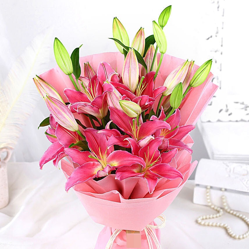 Graceful and radiant, this stunning bouquet features a vibrant cluster of fresh pink lilies, artfully arranged in pink wrapping and tied with rustic twine. Each bloom symbolizes admiration, femininity, and heartfelt affection — making it the perfect gift to express love, gratitude, or celebration.