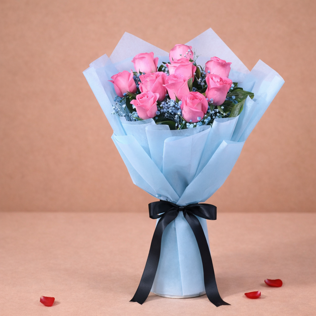 10 Pink Roses Bouquet with Blue Non woven paper packing