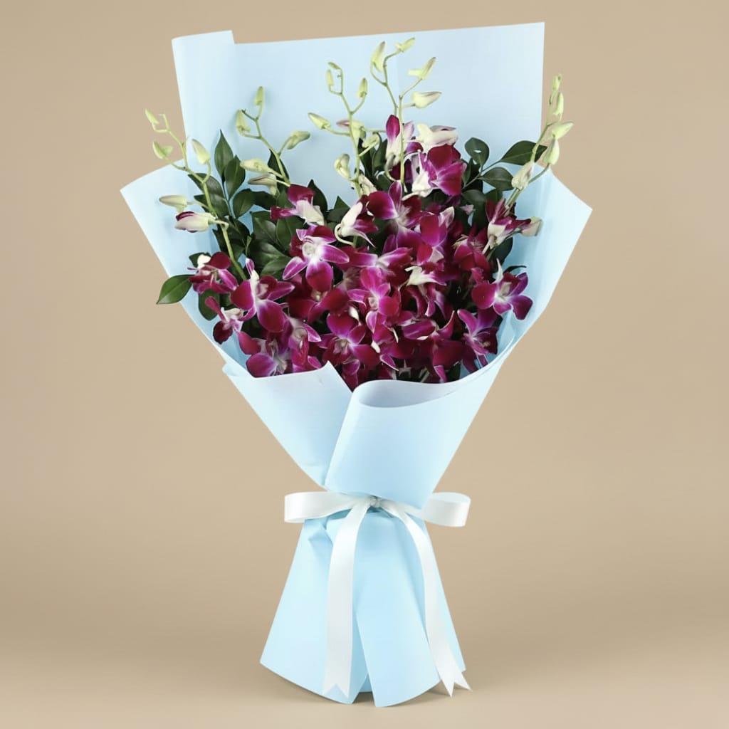 Elevate any celebration with this elegant set featuring 6 fresh purple orchids beautifully arranged in blue non-woven paper packing, tied gracefully with a soft white ribbon for a refined, modern look. The vibrant orchids bring a touch of luxury and charm, making them perfect for birthdays, anniversaries or heartfelt gestures. Paired with a delightful Cadbury Celebrations box, this combo blends natural beauty with irresistible sweetness. Thoughtfully curated to impress, it is an ideal gift choice to convey love, appreciation and warm wishes on any special occasion.