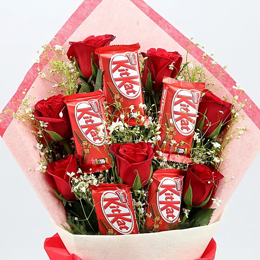 Surprise your loved ones with this charming bouquet featuring 7 fresh red roses paired with 5 KitKat chocolates (18g each), beautifully arranged to create the perfect blend of love and sweetness. The roses are elegantly complemented with delicate baby’s breath fillers, adding a soft and romantic touch. Wrapped in premium paper and finished with a white ribbon, this bouquet makes an ideal gift for birthdays, anniversaries, or special celebrations. A thoughtful combination of flowers and chocolates that expresses affection in the sweetest way. Perfect for making memorable moments even more delightful.