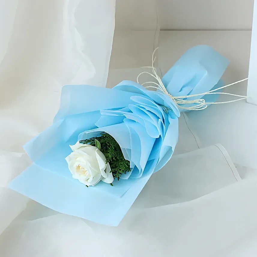 Simple yet deeply meaningful, our Pure Grace bouquet showcases a single elegant white rose wrapped in soft blue paper and tied with natural twine. Symbolizing purity, peace, and heartfelt respect, this minimalistic arrangement speaks volumes through its gentle charm and and most loved product on Bakers Village.